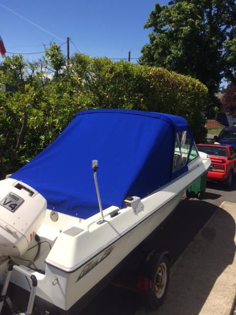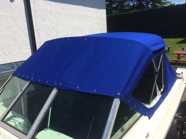 Made and installed convertible top, sloper and side curtains for this Glass-Ply runabout.