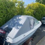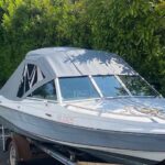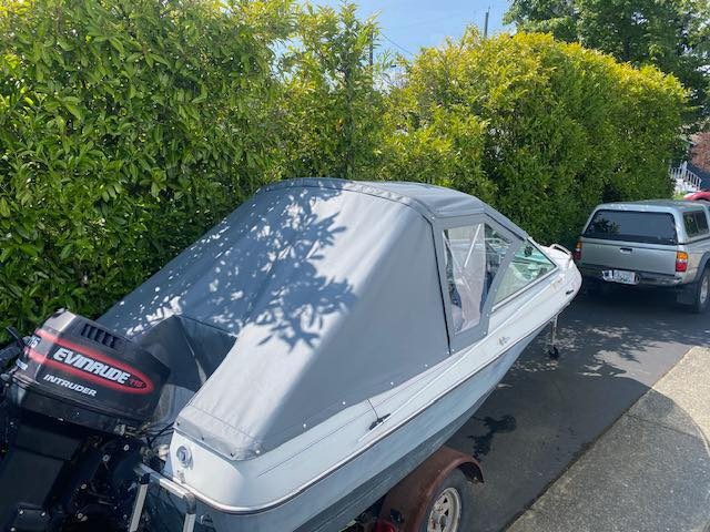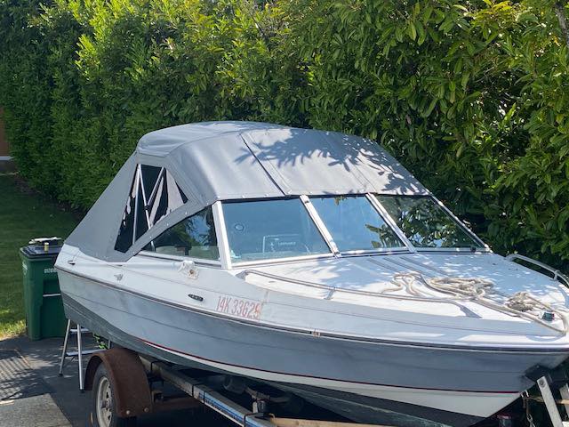 This boat received a new aluminum frame and a new top , sides and a rear sloping rain cover. The Top Gun material is a great product, looks good and will last for years.